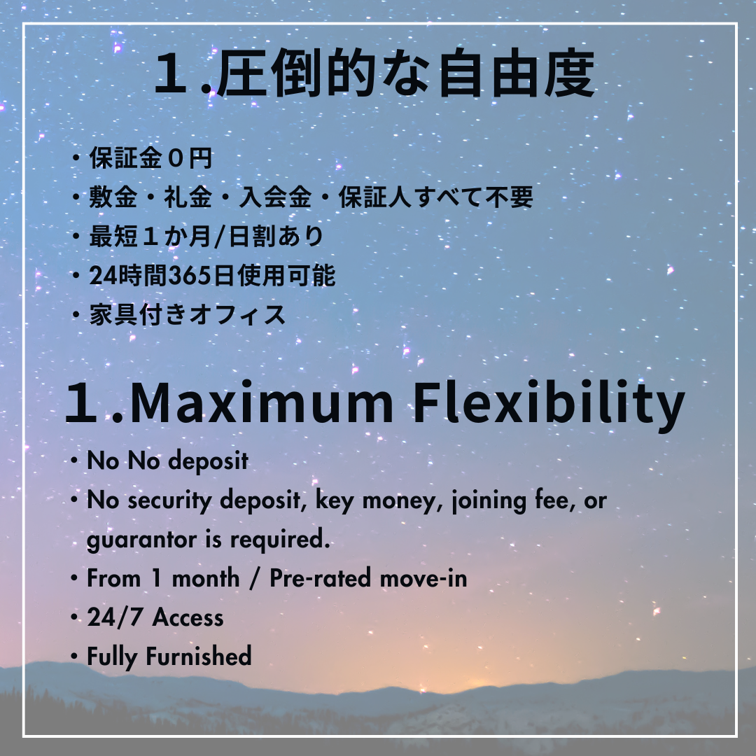 駅近の好立地で、士業の方や海外のお客様にも選ばれています。 あなたのビジネスを、自由に、スムーズに。