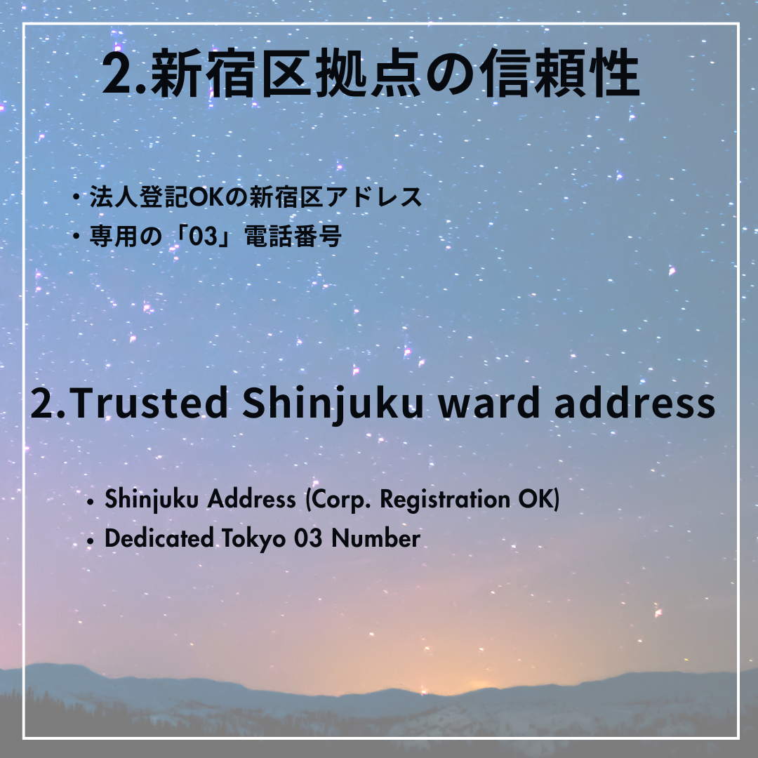 東京・新宿区の住所で法人登記が可能。 都心の一等地をビジネスの拠点にすることで、取引先からの信頼感もアップ。